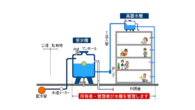 「簡易専用水道」とは、水道事業者から供給される水を受水している施設で、受水槽の有効容量の合計が10立方メートルを超える施設をいいます。